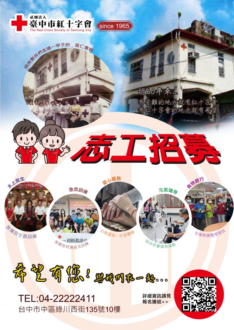 臺中市紅十字會自1965年成立以來,秉持博愛、人道與志願服務精神,深耕社區60年,推動急救防災教育與多元照顧服務,涵蓋長期照顧服務、家庭照顧服務、食物銀行、健康幸福補給站、志工培力,接住每一個照顧者與被照顧者,陪伴每一位需要的人。
