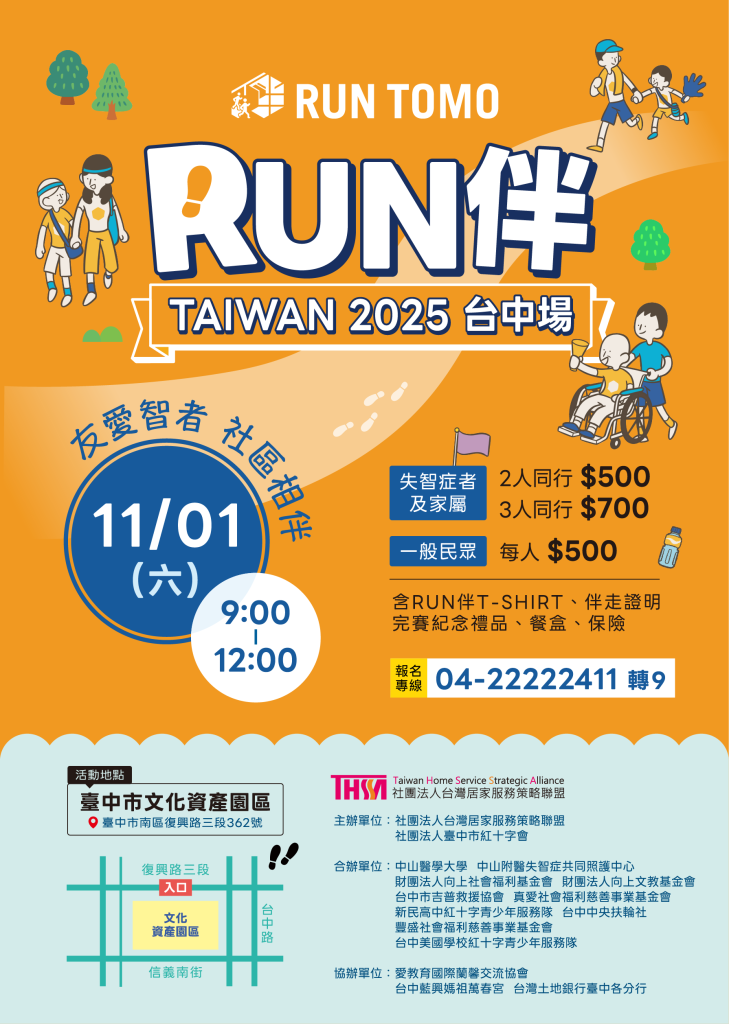 社團法人臺中市紅十字會將再次與台灣居家服務策略聯盟合作舉辦「RUN伴 TAIWAN 2025 台中場」,以「友愛智者,社區相伴」為主題,邀請失智者與家屬共同參與,也歡迎一般民眾加入,一起用雙腳與笑容傳遞善意,讓社區更友善、讓愛同行。參加者可獲得活動 T-shirt、伴走證明、完賽紀念禮品、餐盒與保險,在輕鬆愉快的步行中體驗陪伴的溫度與力量。